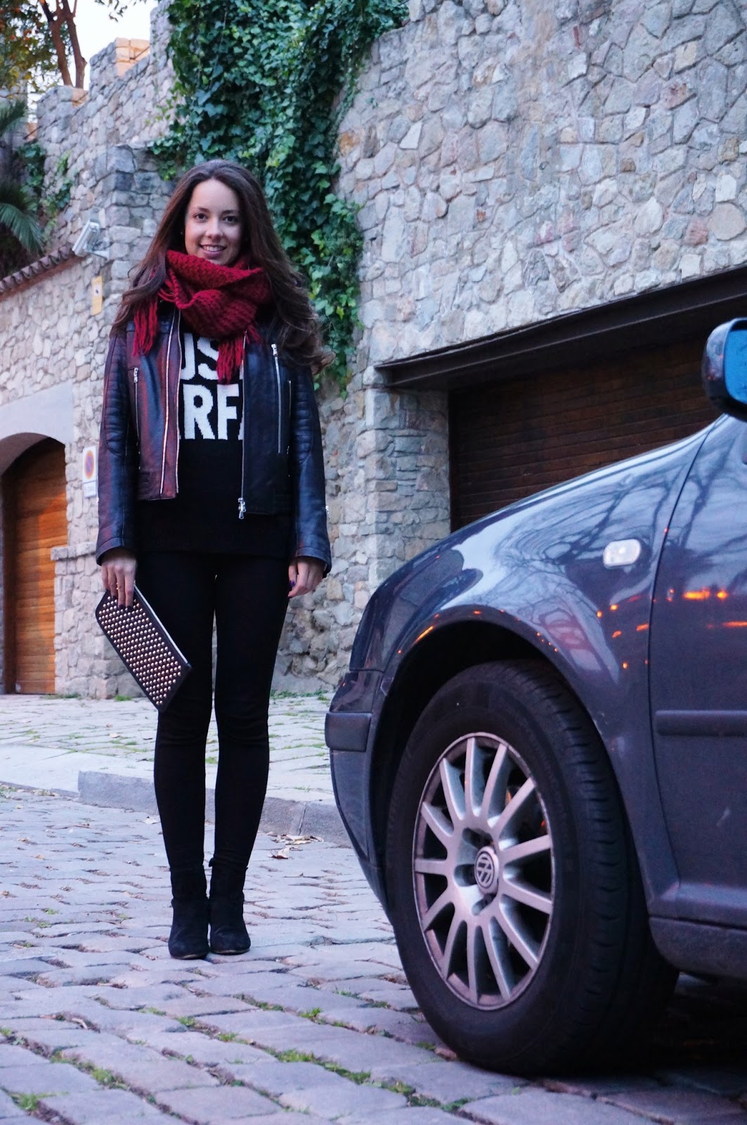 ¡Cazadora de cuero negra + Bufanda granate! / Black ...